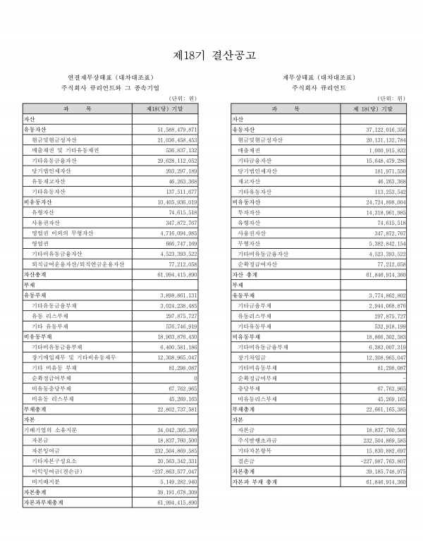 주식회사 큐리언트 제18기 결산공고